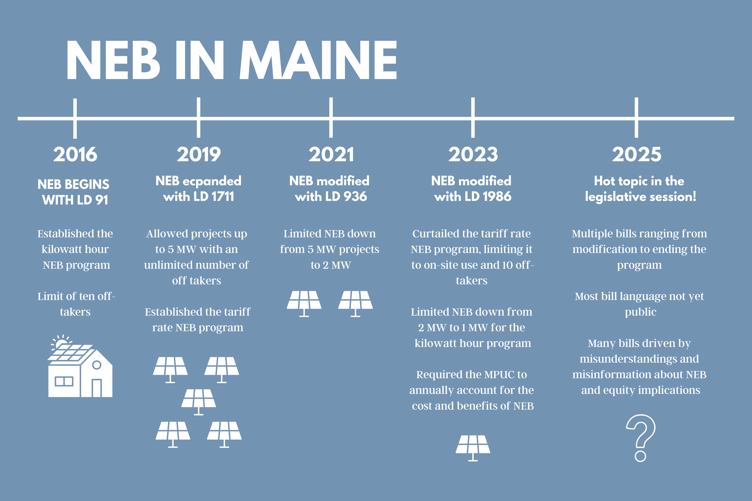Net Metering, also known as Net Energy Billing (NEB) in Maine is a billing system for customers that generate electricity. When you generate energy your bill will reflect any excess generation and usage beyond what is generated or purchased on your bill. If you have excess generation in a billing period, it is banked for later use.